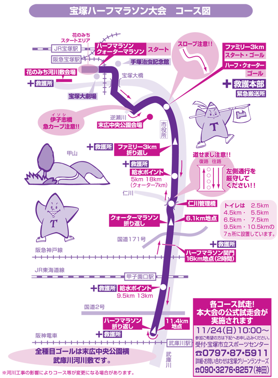 宝塚ハーフマラソンは、今年で15回目で一年の健康づくりの総決算に、今年の走り収めに、宝塚を走ろうというコンセプト。走るコースは、宝塚大劇場前をスタートし、宝塚大橋を渡り、末広中央公園方面から武庫川の河川敷へ出てをひたすら南へ。阪神武庫川駅付近の折返し地点から、同じく河川敷をもどり北上し、末広中央公園付近でゴールする。