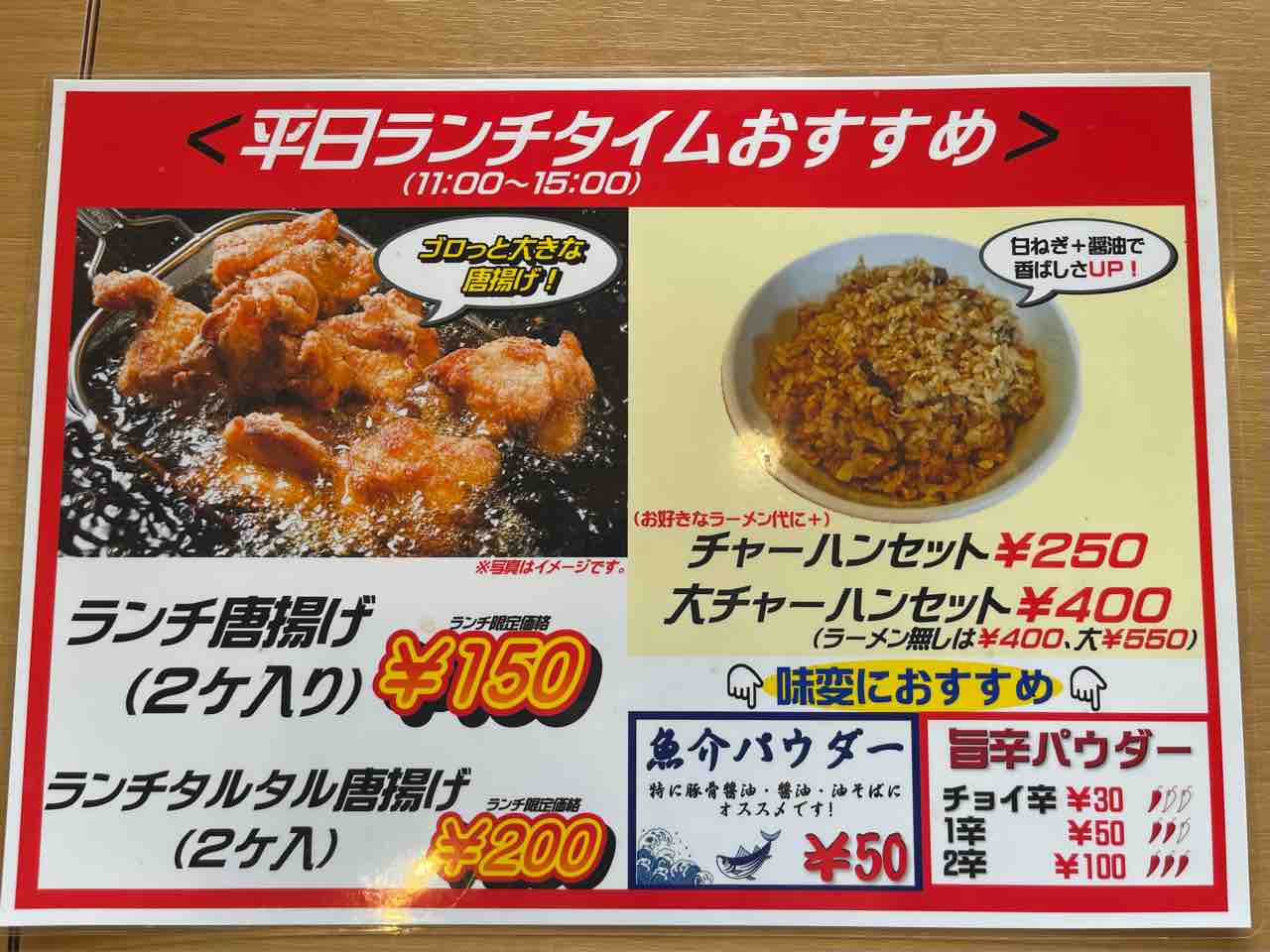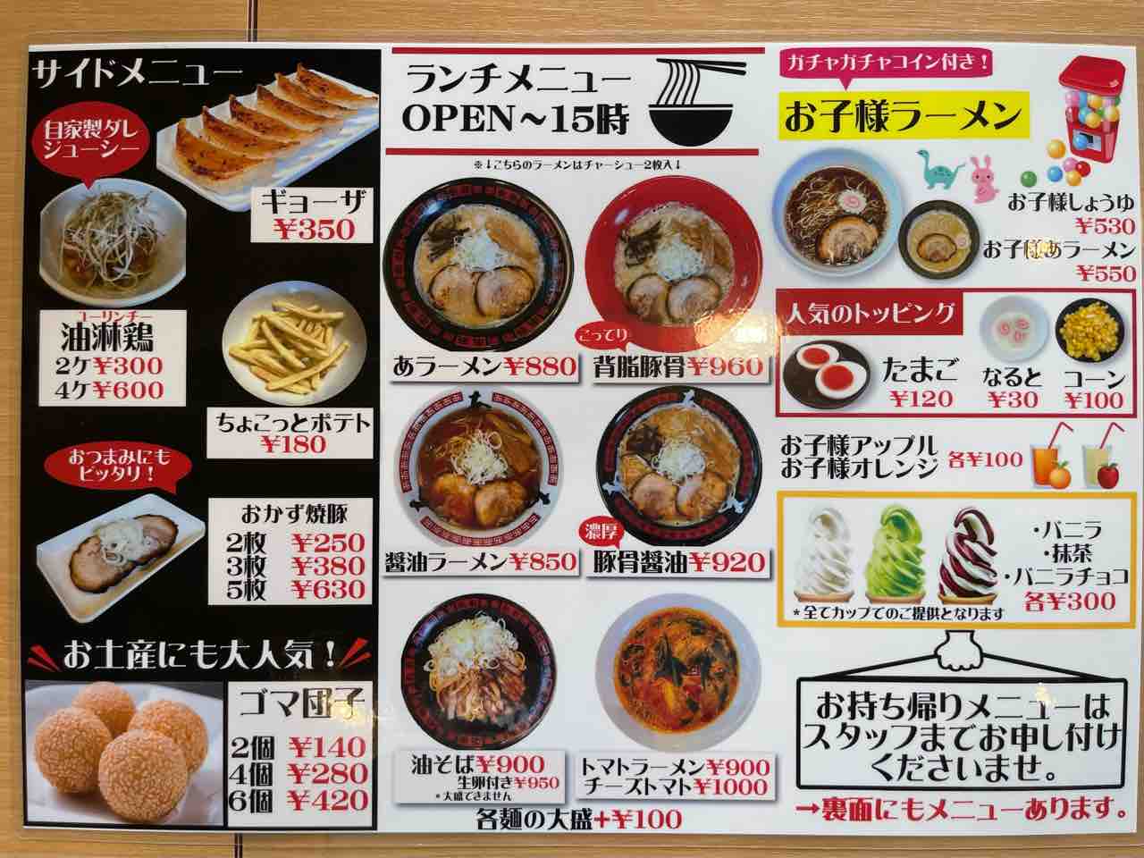 メニューはこんな感じ。あラーメンでも十分濃厚ですが、更に濃厚な背油入りも気になりますし、逆にあっさり系の醤油ラーメンも気になります。