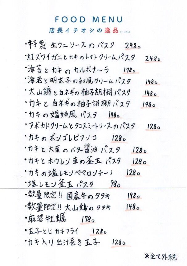 私自身、ここにはパスタランチをよく食べに行っていたので、いつものパスタは食べられるのか、それともランチメニューも牡蠣専門店としてがらりと変わってしまったのか?を確かめにいってみた。確かに7割強のメニューに牡蠣が使われている状態ではあるが、これまでのパスタメニューに牡蠣が加わっているというメニュー構成だった。それでも、牡蠣以外のメニューも存在しているので、普通にボロネーゼ、カルボナーラ、塩レモンペペロンチーノ等をたべる事ができる。