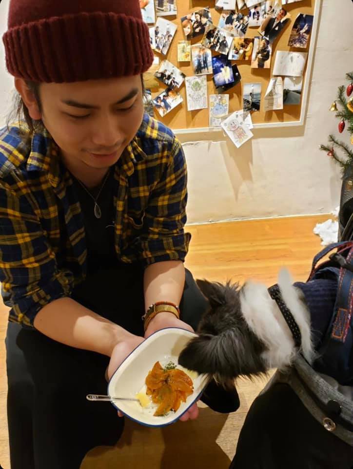 ワンちゃんメニューは、人気のササミハンバーグ、とろっとろの柿のオーブン焼きの用意がある。 「人間は牡蠣、ワンちゃんは柿!」