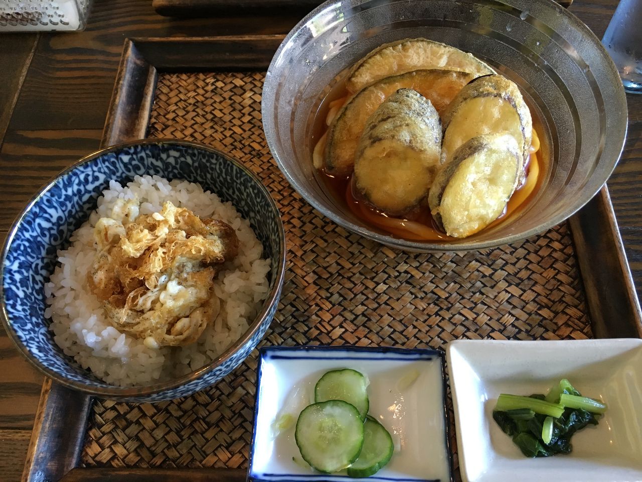 うどん(冷やしぶっかけナス天、かぼちゃ天)、ごはん(たまごの天ぷらのっけ醤油ご飯)