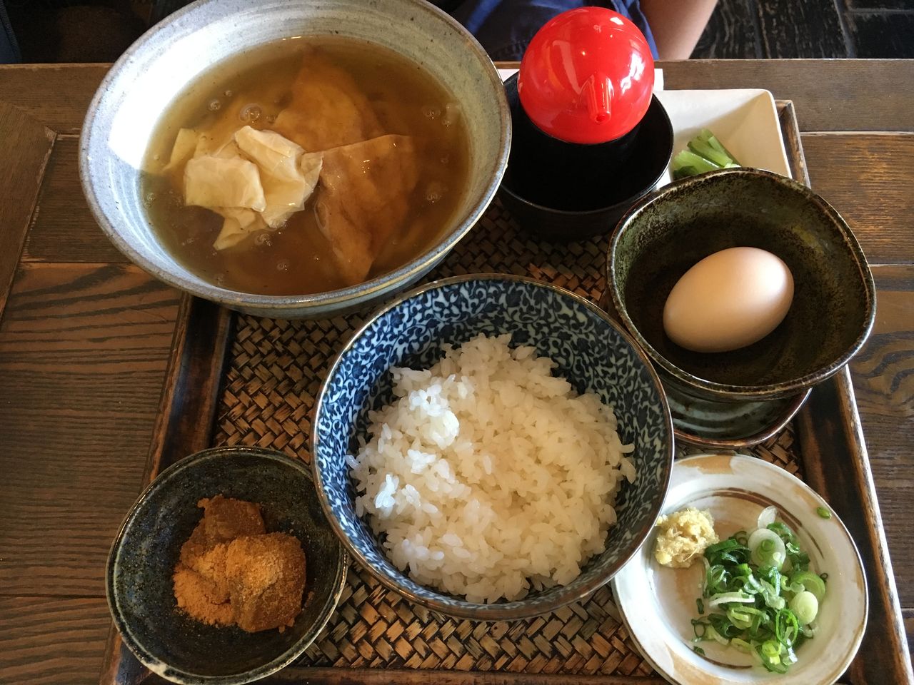 うどん(湯葉ときつねあんかけ)ごはん(たまごかけご飯 わらび餅付き)