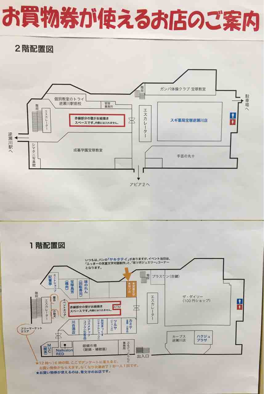 落書きスペースは、1階だけでなく2階でも実施されています。(配置図の赤い枠)リニューアル工事中も変わらず営業されています。お買い物の際に落書きしてみてはいかがでしょう。