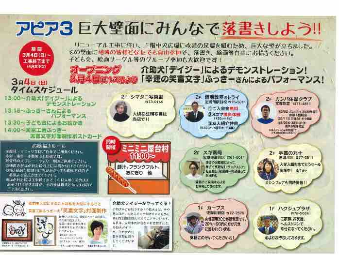 3月4日(日)よりリニューアル工事開始ということで、当日にはオープニングイベントが開催されました。内容は介助犬「デイジー」によるデモンストレーションや、「幸運の笑富文字」ふっきーさんによるパフォーマンスなど。