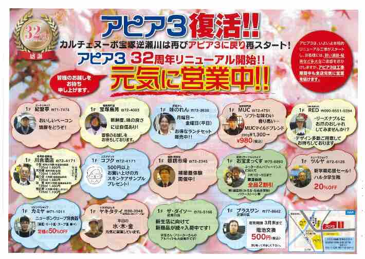 「カルチェヌーボ宝塚逆瀬川」は、2011年6月に「アピア3」から名称変更しリニューアルされましたが、32周年となる今年2再び「アピア3」として再スタートするとのこと。