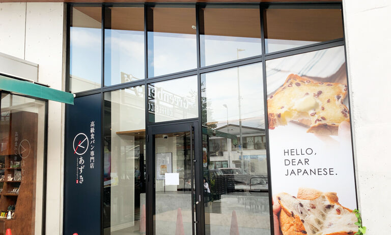 看板の写真にもある高級食パン専門店 あずき のロゴは、紅白の水引をイメージして作成しているとのことで大切な節目に特別な贈り物として、選んで頂ける事を目指しており、SHIROとAZUKIをセットにして「紅白食パン」と名付けたそうだ。その他にも、AZUKIとMATCHAの「椿セット」やSHIROとMATCHAの「鶯セット」など、名付け方が魅力的だ。