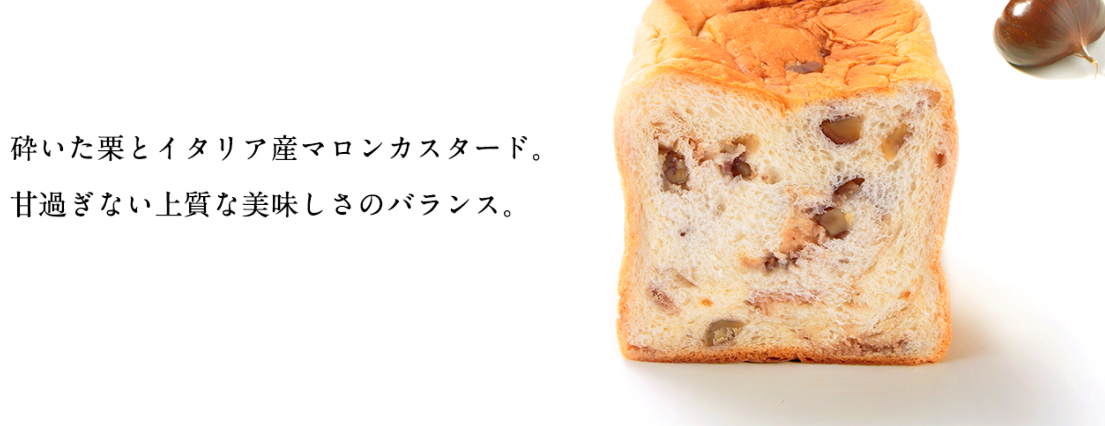 栗を砕き、栗粒のままゴロゴロと入れ、イタリア産のマロンのカスタードを生地に練り込みました。スウィーツと同等の食材でありながら、決して甘過ぎず絶妙なバランスの栗食パンです。