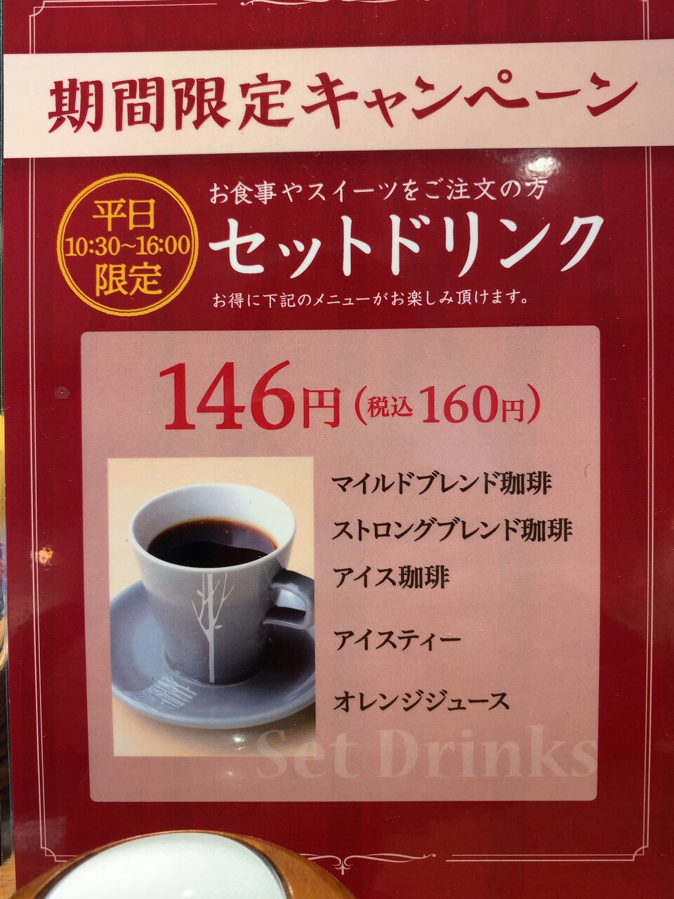 期間限定との事ですが、セットドリンク 税込160円 や、お替り自由のロングステイ珈琲:紅茶 税込640円 もあって、私のような長時間利用の人には、助かるお店です。