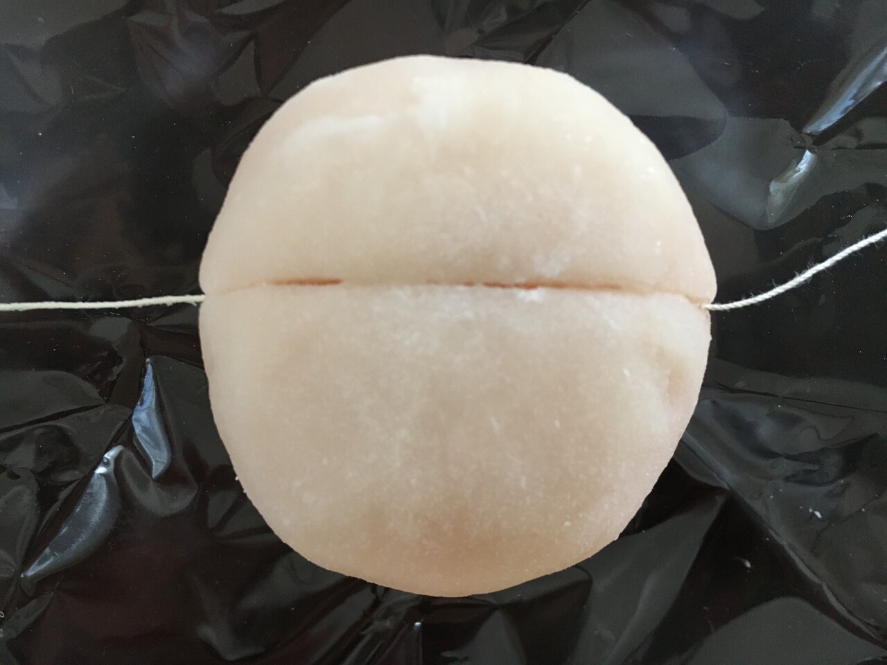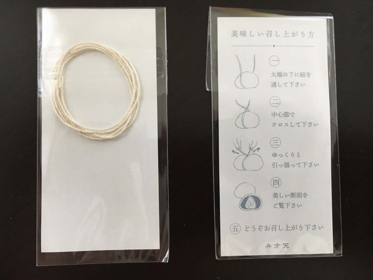 箱の中には専用の餅切り糸が入っており、切り方の説明も書いています。包丁で切ると潰れがちな大福の断面も、この凧糸でできた餅切り糸なら、最小限の力でキレイに切れるとのこと。