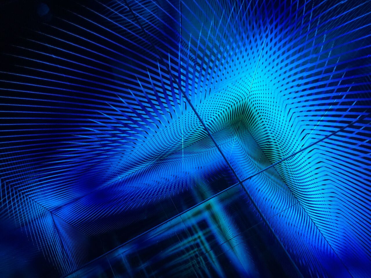 天井まで届きそうな大きな箱の中に入ると、中は暗く全面鏡になっています。床も鏡なのですが、下を見るとかなり深いところまで空間が続いているように見え、最初は怖くて足を踏み込めませんでした。しかし、一歩中に踏み出すと、そこには無数の光が雪のようにキラキラと輝いています。この光は、音に反応するようになっていて、静かにすると小さく、音を出すと大きく光っていました。