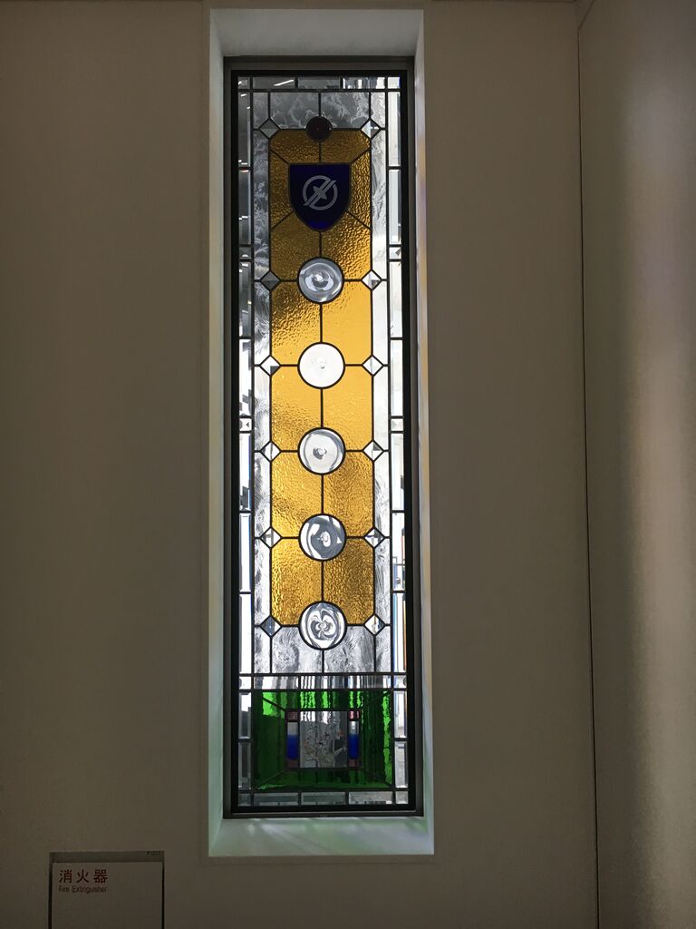 1階エレベーター横のステンドグラスには、さりげなく宝塚市のマークやすみれの花が入っていました。