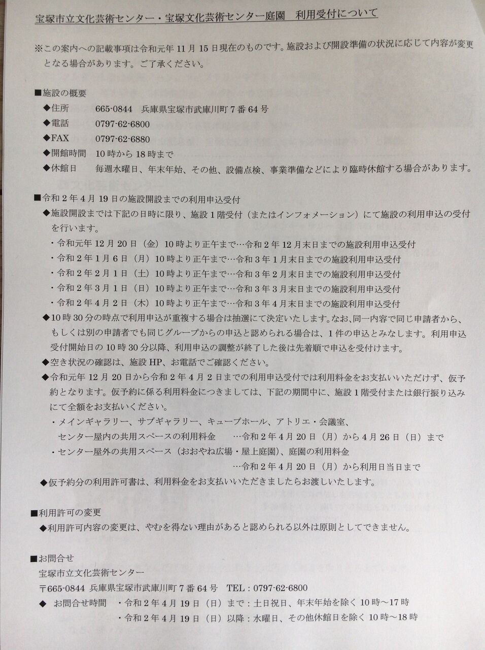 事前に申し込んでいた「宝塚市立文化芸術センター 利用者向け見学会」(宝塚ファミリーランド・ ガーデンフィールズ跡地)が先日、11/15(土), 16(日)に開催された。場所はご存知「手塚治虫記念館」のお隣である。この施設のグランドオープンは2020年4月21日。現在、施設内部はほとんどの工事が完了し、外の庭園部分がまだ工事中の状況。当日の説明会は1時間毎で数回に分かれて実施されており、私は11/16 (土) 11:00の組に参加し、A班で説明を伺った。おそらく説明会の全体は100人以上の参加ではないだろうか。