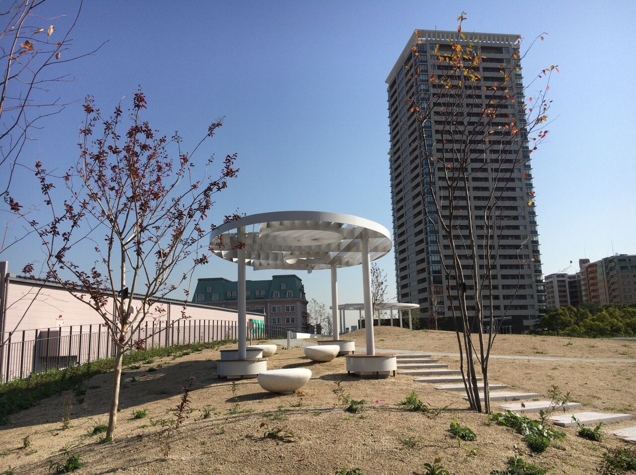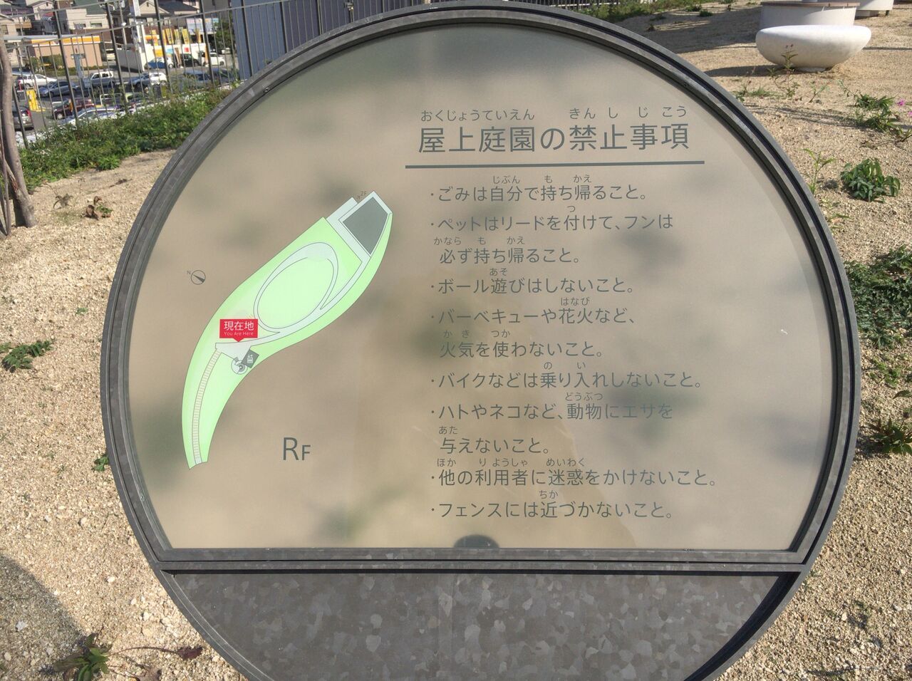 屋上庭園。禁止事項も書かれいてる。今はまだ芝が生えきっていないが、春には青々とした緑の芝生になるようだ。
