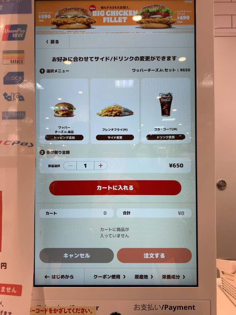 ワッパーが一番大きいのか…と理解しながら、セットがお得っぽいので、ワッパーのセット650円が安くてお得感ありと注文…。