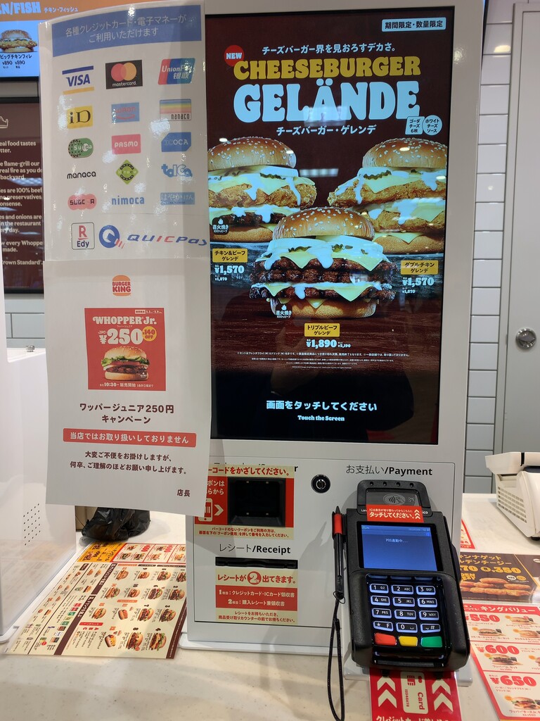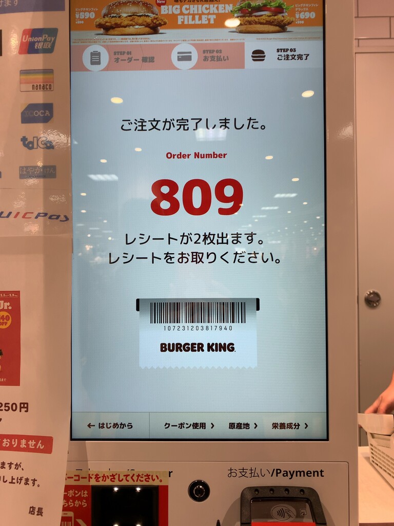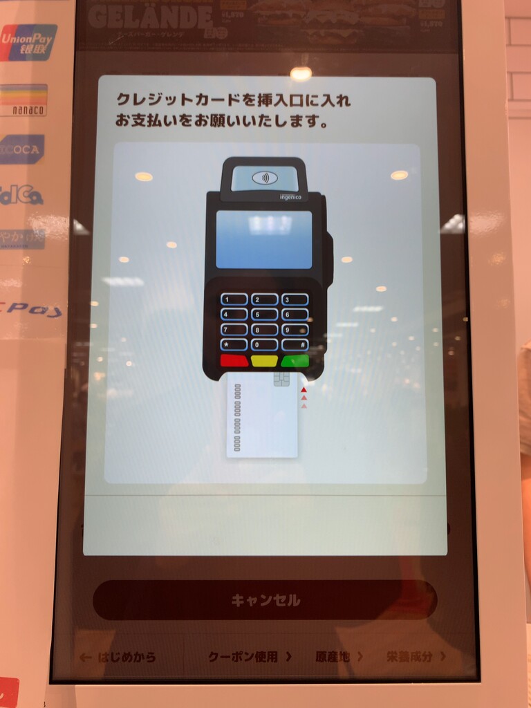 あとは、クレジットカードを差し込んで、暫く待つと決済完了。注文は自動で厨房へ。