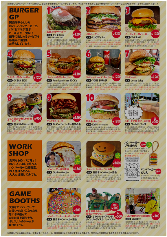 人気ハンバーガー店10店が宝塚に集まり、普段なかなか味わえない特別なバーガーを提供してくれます。どれも美味しそうです。