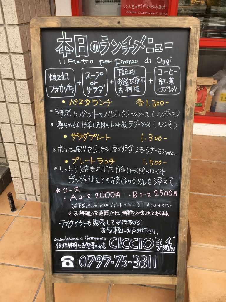 CICCIO(チッチョ)は、誰でも気軽に入れるイタリア料理店。CICCIOとは “ぽっちゃり”という意味だそうで、「以前、行った事があるイタリアで見かけたネコの名前なんです。」と店主夫妻。ランチメニュー、テイクアウトメニューもあり。今回は「本日のランチメニュー」のご紹介です。