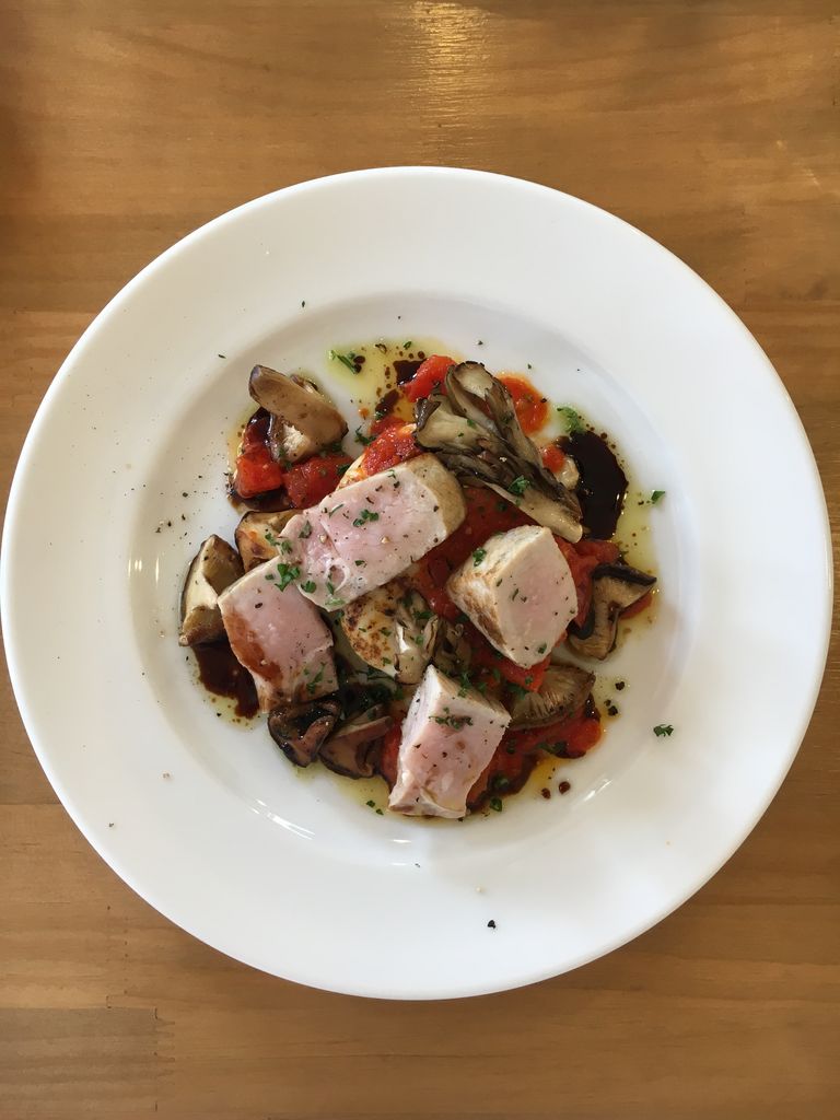豚ロース肉のロースト ピッツァ仕立ての丸茄子のグリル和え。ロースト肉、茄子、ソースにピッツアのようにチーズが絡んで、味を引き出します。