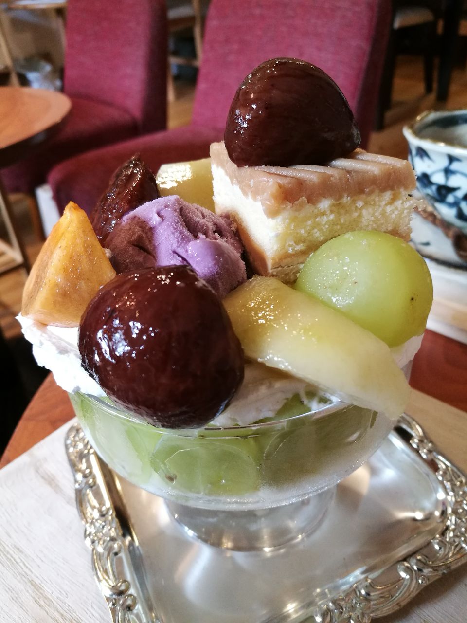 大粒の栗の渋皮煮、洋ナシ、柿、グラスの周りにもたくさんのマスカット、モンブランのプチケーキ、紫芋のアイスクリーム、秋の味覚がこれでもか!とたっぷりです。中にはコーヒーゼリー、生クリーム、プレーンヨーグルト、カスタードクリームが入っていて、食べ進めるのが楽しかったです。