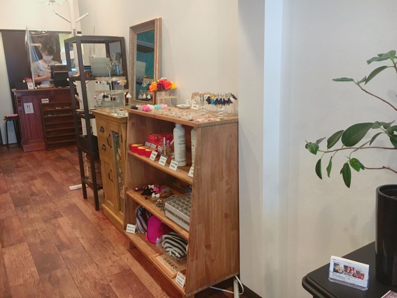 店内の一角にはアクセサリーの販売スペースがあり、レジの横には4人まで入れる半個室もありました。