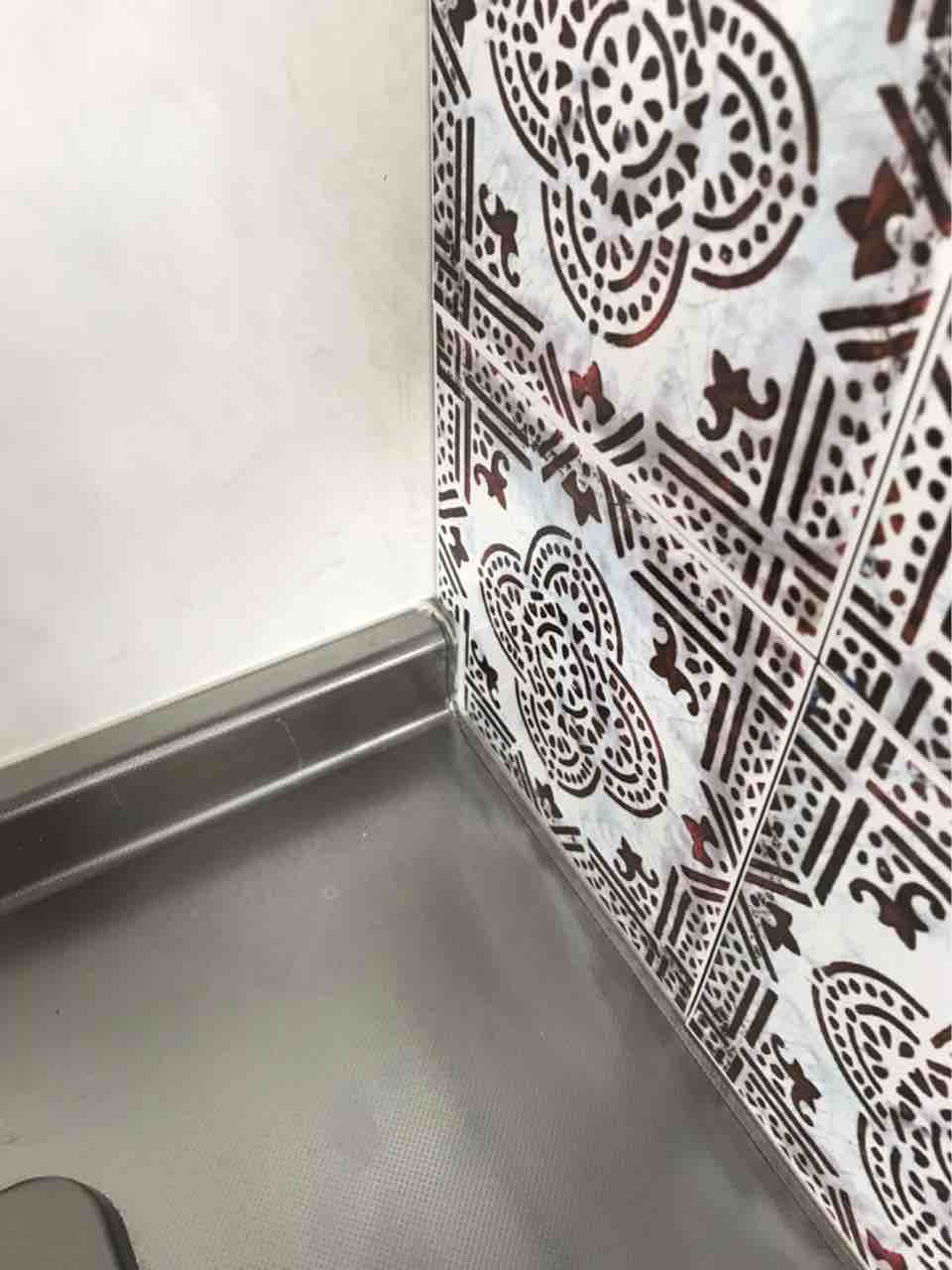壁の段差は、タイルステッカーをカットして高さを揃える。