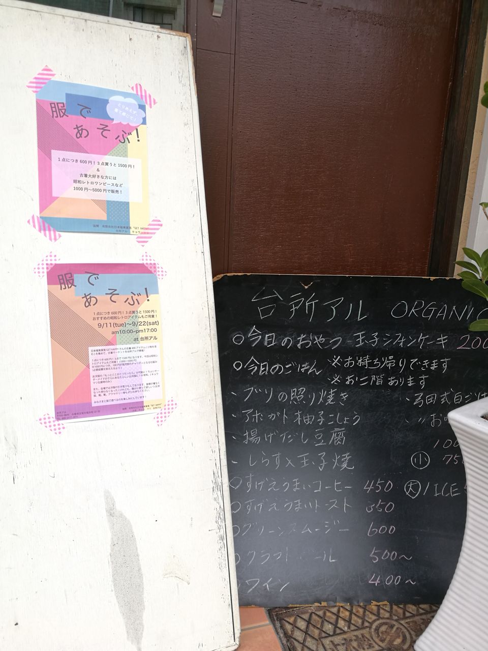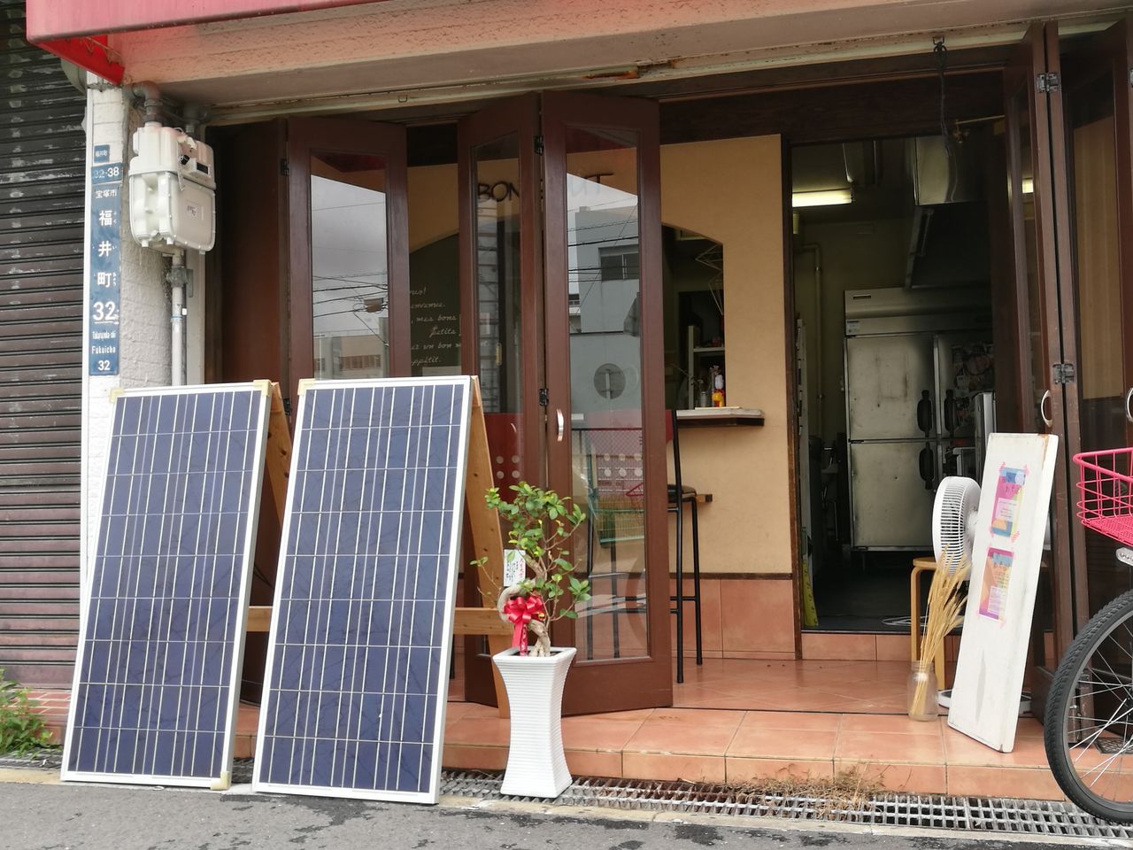 でっかい太陽光パネルが店頭に?メニューの看板があるからごはん屋さん?時々チラシが貼ってるのも気になる…何かイベントをされている?この不思議なお店は「台所アル」。