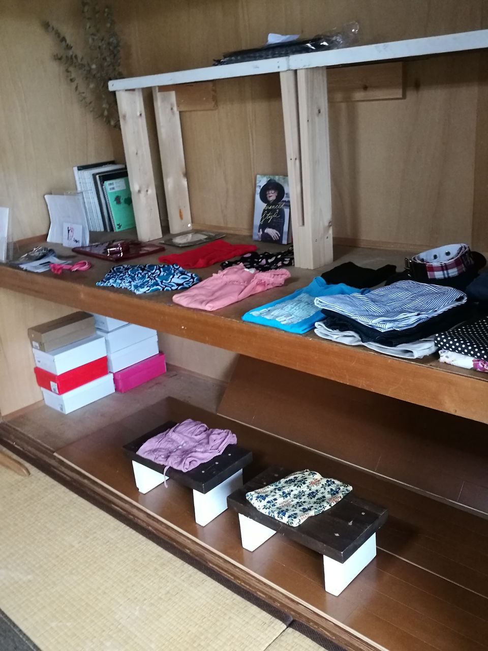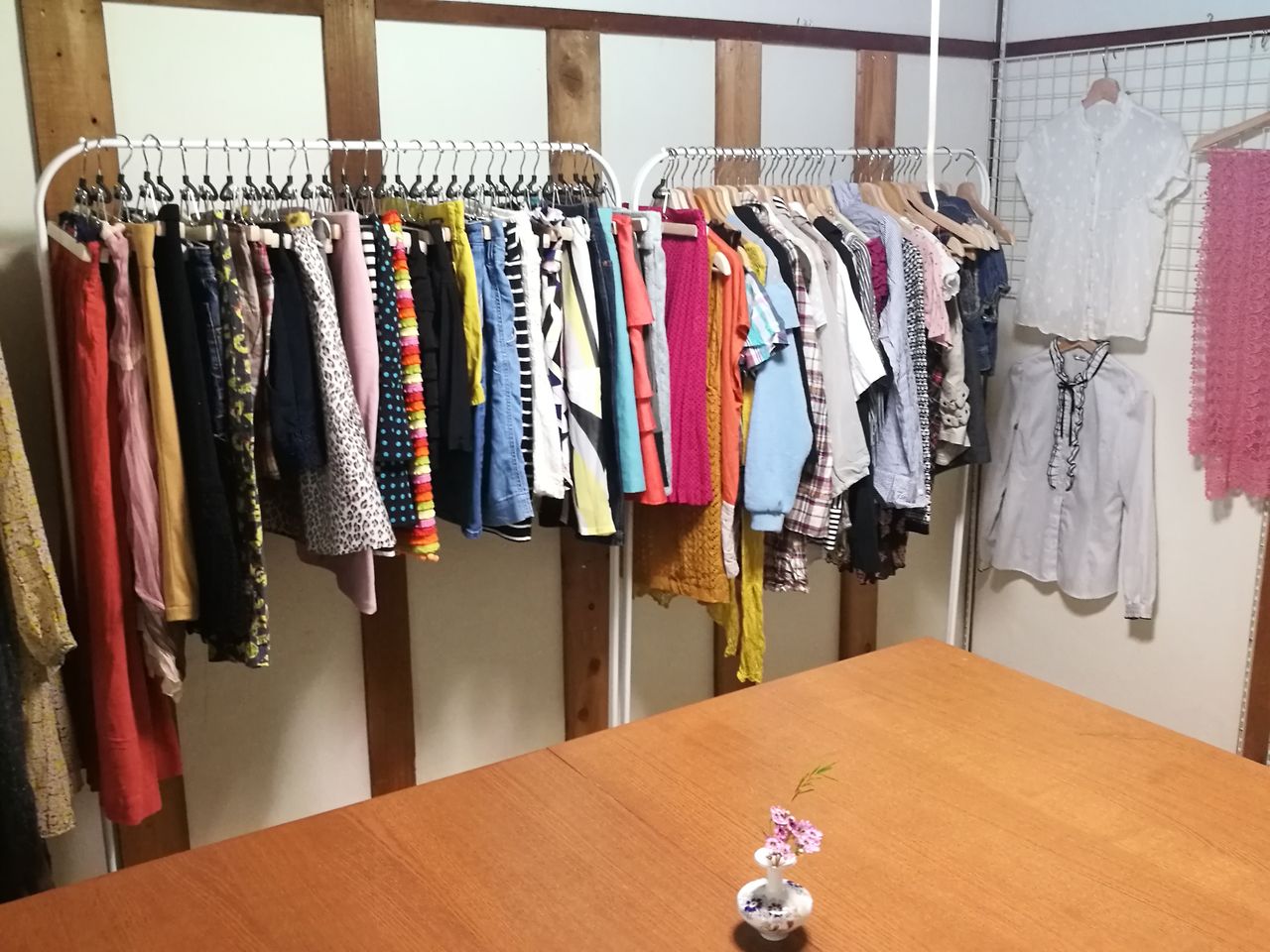 ラインナップは夏の終わりから秋にかけての軽い羽織ものやシャツ、ブラウス、スカーフ、靴やベルトなどがありました。昭和レトロな古着~新作まで。いつもは選ばない服をとっかえひっかえいろいろ着てみて楽しめます。