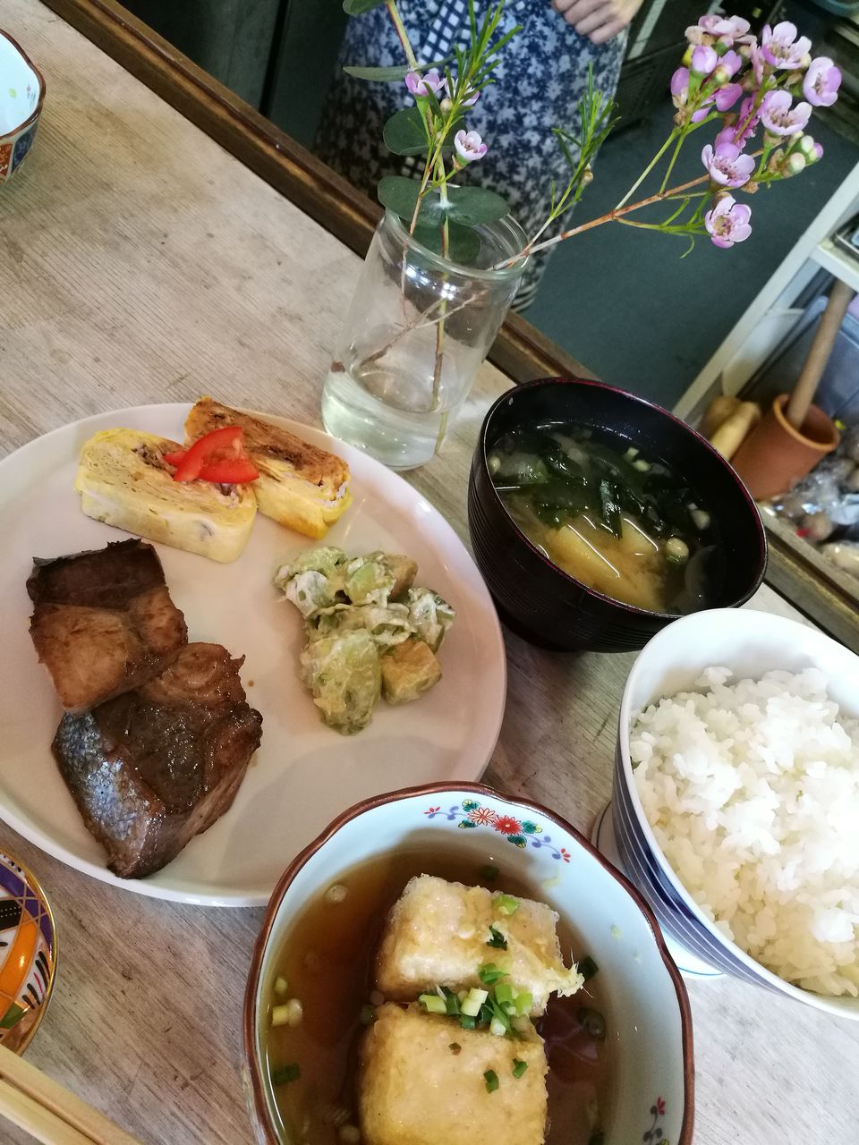 この日のメニューは、ぶりの照り焼き、揚げ出し豆腐、アボカド柚子胡椒、しらす入り卵焼き、弓田式ごはん、具たくさんの弓田式お味噌汁。弓田式ごはんはほんのり塩味。いりこや昆布、ナッツ、オリーブオイル、岩塩が入っていました。身体も心もほっとするおいしさです。