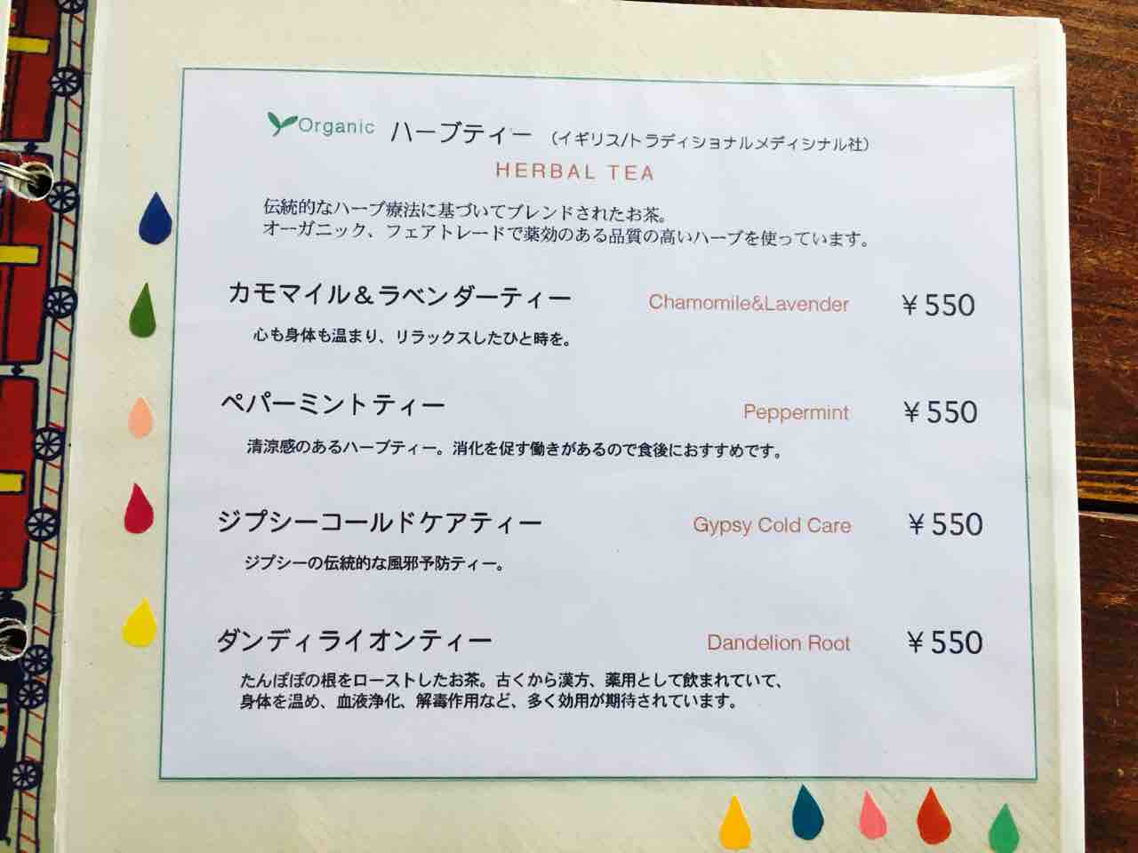 オーガニック、フェアトレードのハーブティーもいろいろあります。他にもコーヒーや、ジンジャーレモンなど、オーナーさんのこだわりのドリンクの種類が豊富で迷います。