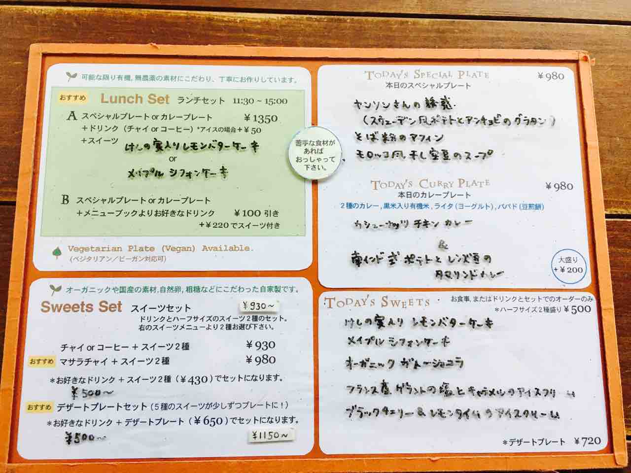 ランチセットはスペシャルプレートとカレープレートの2種に、ドリンクセットかドリンク+スイーツセットが選べます。スイーツセットは5種類のスイーツから選べるのもうれしい。