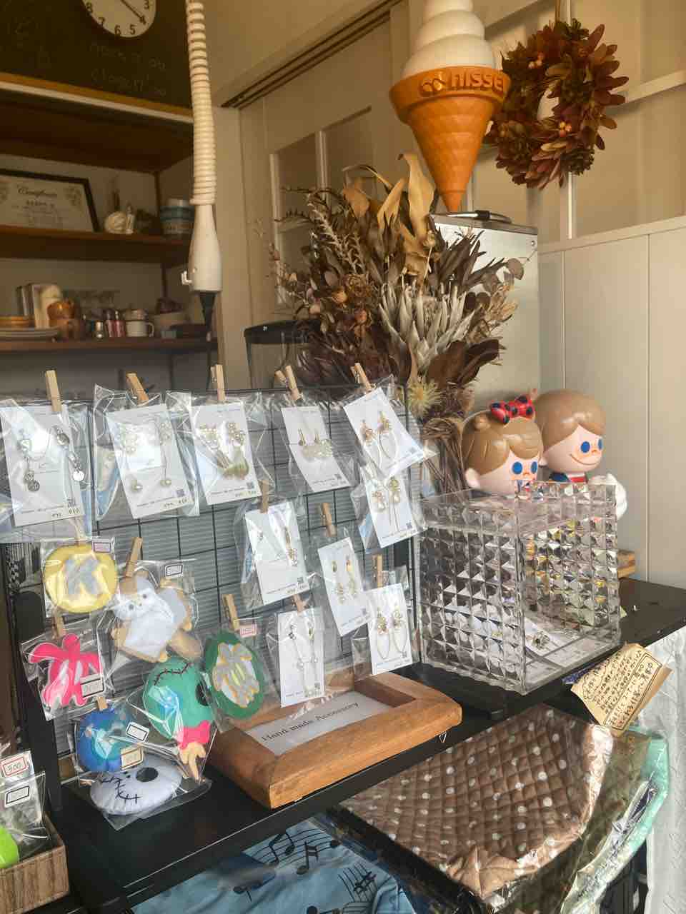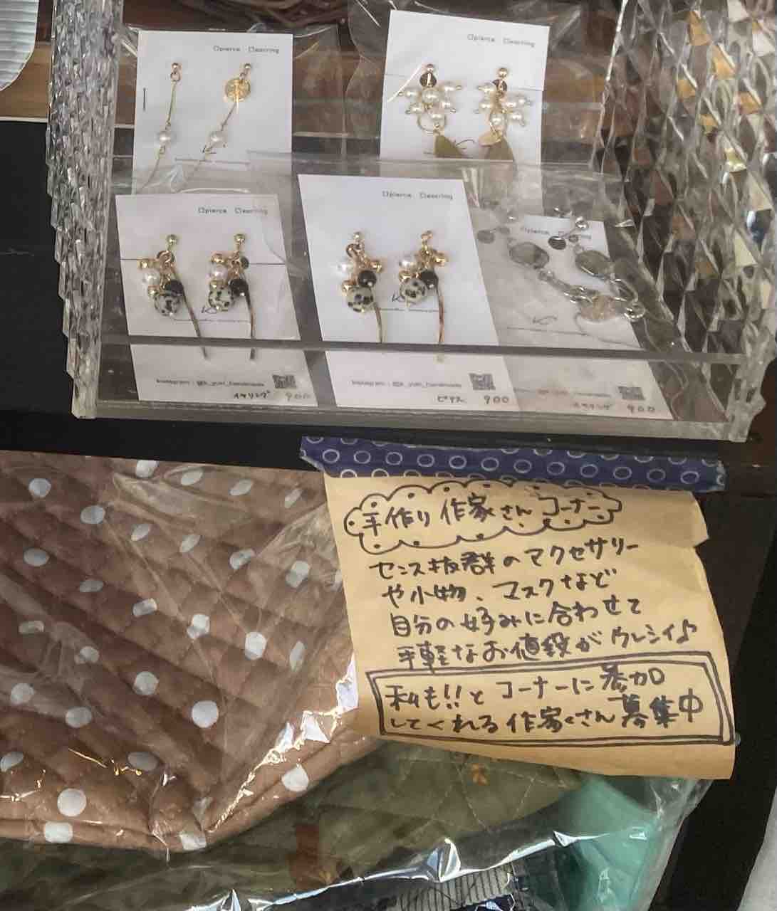 カウンター脇に、「手作り作家さんコーナー」がありました。手作り作家さんが作った雑貨やアクセサリーを買うことができます。