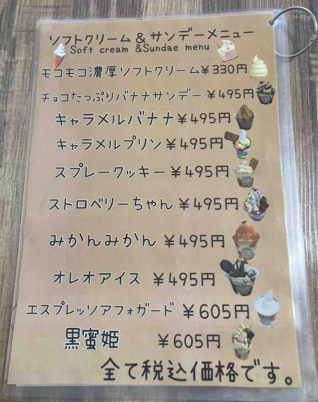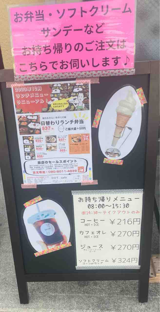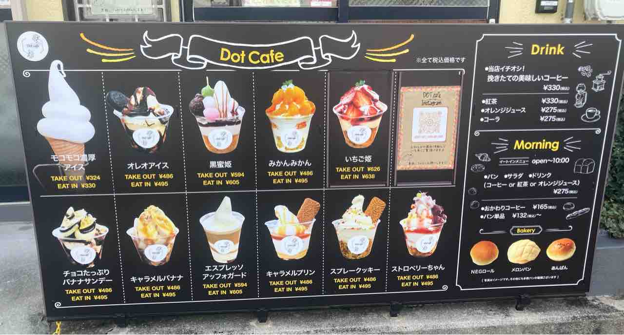 美味しそうなデザートがたくさん描かれた看板。Dot.Cafeのソフトクリームは、モコモコしていて濃厚なミルク味で、とても美味しいんですよ。「みかんみかん」というデザートも人気らしいです。