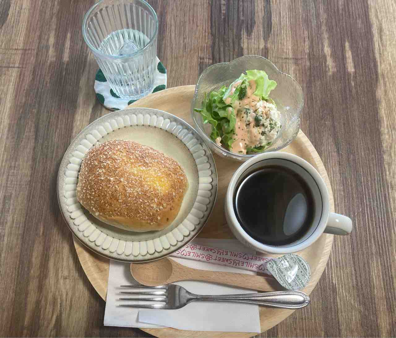 カレーパンにしました。お皿に入れ、温めて出してくれます。今日のサラダはおからのサラダでした。とってもヘルシーで美味しいサラダに大満足。コーヒーも苦過ぎず適度な濃さで、とても美味しかったです。