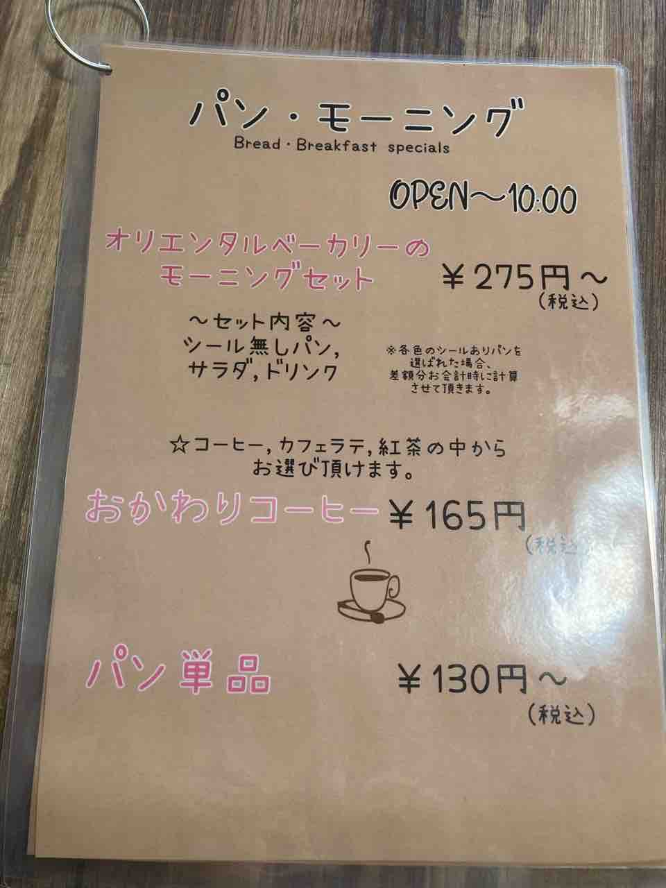 メニューを見てみます。パンモーニングは、オープン時の8時半から10時まで。本当に税込275円という安さです。