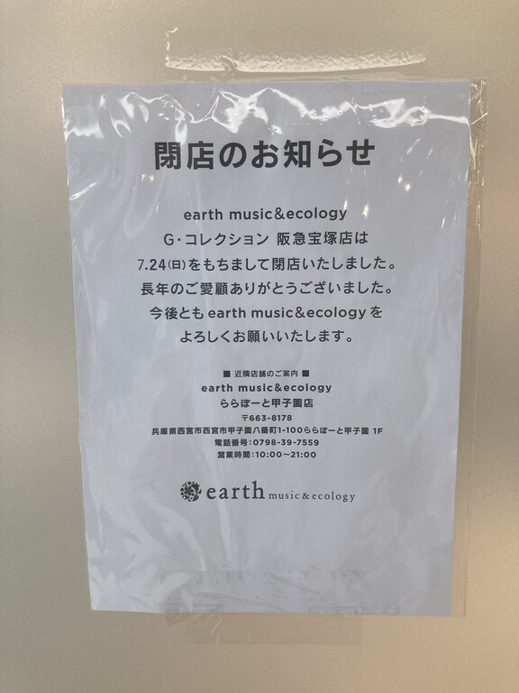 宝塚駅付近では、10代、20代~向けのアパレル店が少ないので、「earth music&ecology」が無くなってしまうのは少々残念なところです。