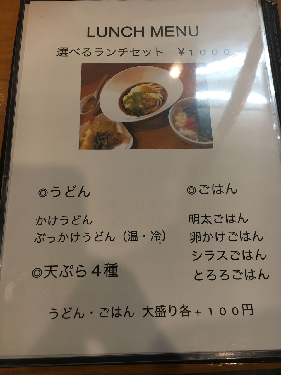今回頂いたのは、選べるランチセット。うどん(かけ、ぶっかけ冷、ぶっかけ温)ご飯(明太、卵かけ、しらす、とろろ)を選ぶ事ができる。女性には、うどん小・サラダ・天ぷら3種・ドリンクがセットになったレディースセットをお薦めする。