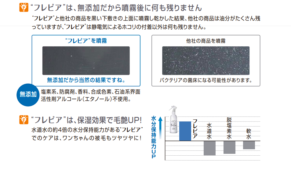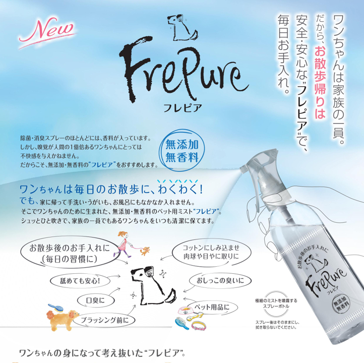この商品、なかなかのスグレモノらしい。通常のペットの除菌・消臭スプレーは、ほとんどが香料や、防腐剤が含まれているが、フレピアは、無添加・無香料なので、ペットにとって安心・安全でストレスを与えないそうだ。製造メーカーは伊丹市に本社があるNDE株式会社で、日本で唯一の光触媒技術をもって、純水を機能化することによって、完全無添加の消臭除菌水を製造する事が出来たそうだ。
