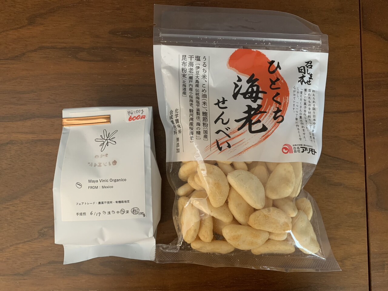 オーガニック&フェアトレードのコーヒー(粉)と無添加おせんべいを買いました 。