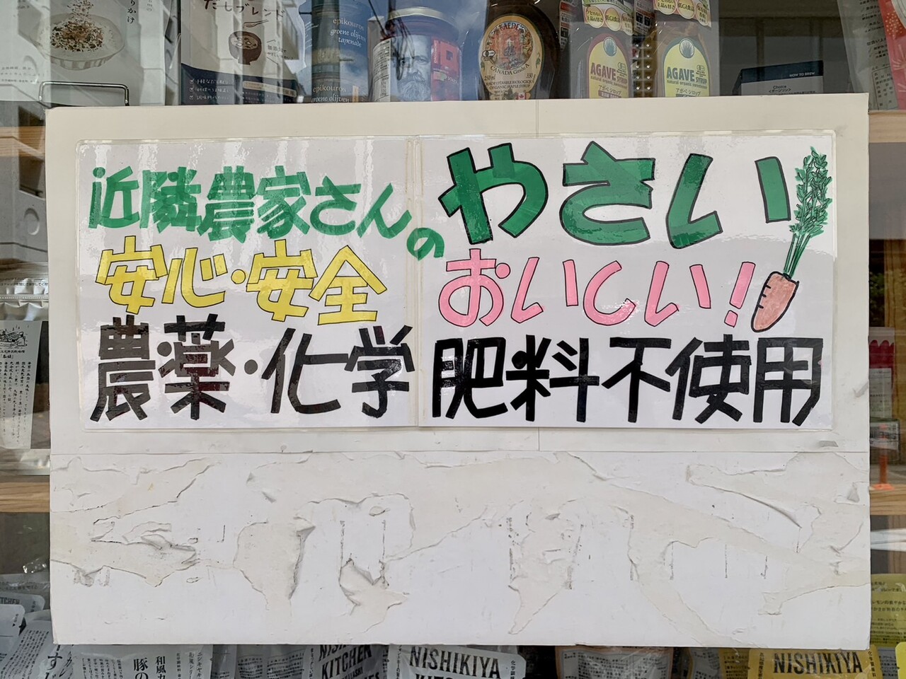 顔の見える生産者さんとのつながりを大切にしてる店主が、おいしさと安心・安全をお客さまに伝えられるよう、イラスト入りのていねいなPOPで商品を紹介しています。