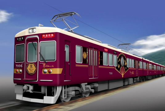 現行の観光特急『京とれいん』は、「お客様を京都までお運びする列車」ということから『京とれいん』と名づけ、「和モダン・京町家」をイメージした内装に仕立てて、2011年3月から梅田~河原町間で運行していた(土・日曜・祝日のみ)。今回導入する『京とれいん 雅洛』は、現行の『京とれいん』のイメージを継承しつつ、「ご乗車されたときから京都気分」をコンセプトに、“京都”を五感で感じるデザインに7000系車両が改造されている。また、『京とれいん 雅洛』は、6両編成の1両ごとに季節を定め、すべての車両が異なる外観や車内にデザインが施されている。