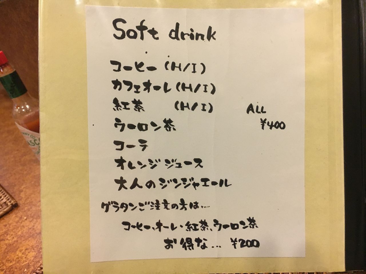 ドリンクメニュー。グラタン注文すると、珈琲、オーレ、紅茶、ウーロン茶は200円とお得。