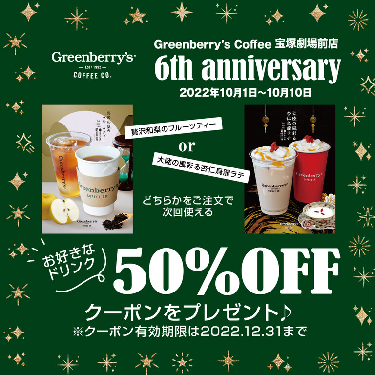 「グリーンベリーズコーヒー」宝塚劇場前店がオープン6周年!記念イベント開催【10/1~10/10】