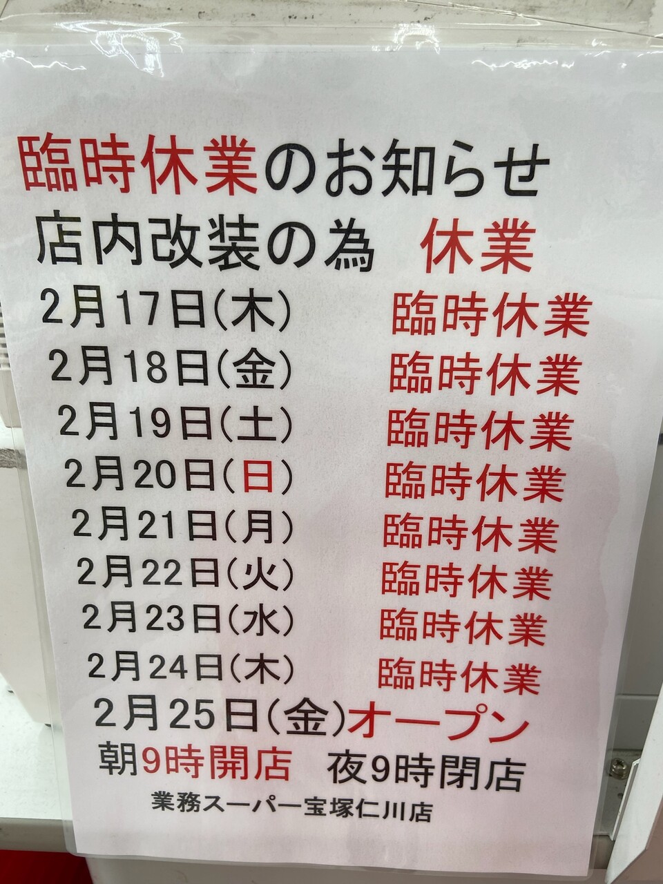 【臨時休業】業務スーパー宝塚仁川店、店内改装のため2/17〜2/24