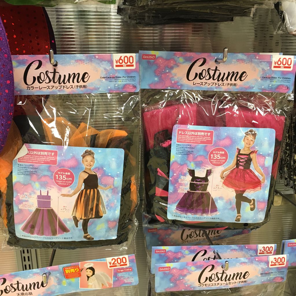 コスチューム系は大人から子どものものまで。100円以外にも300円~1000円のものもあります。