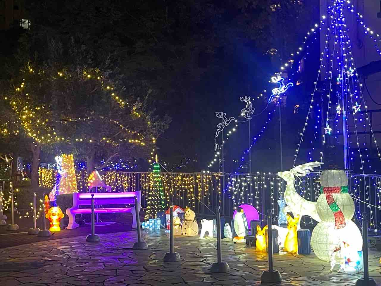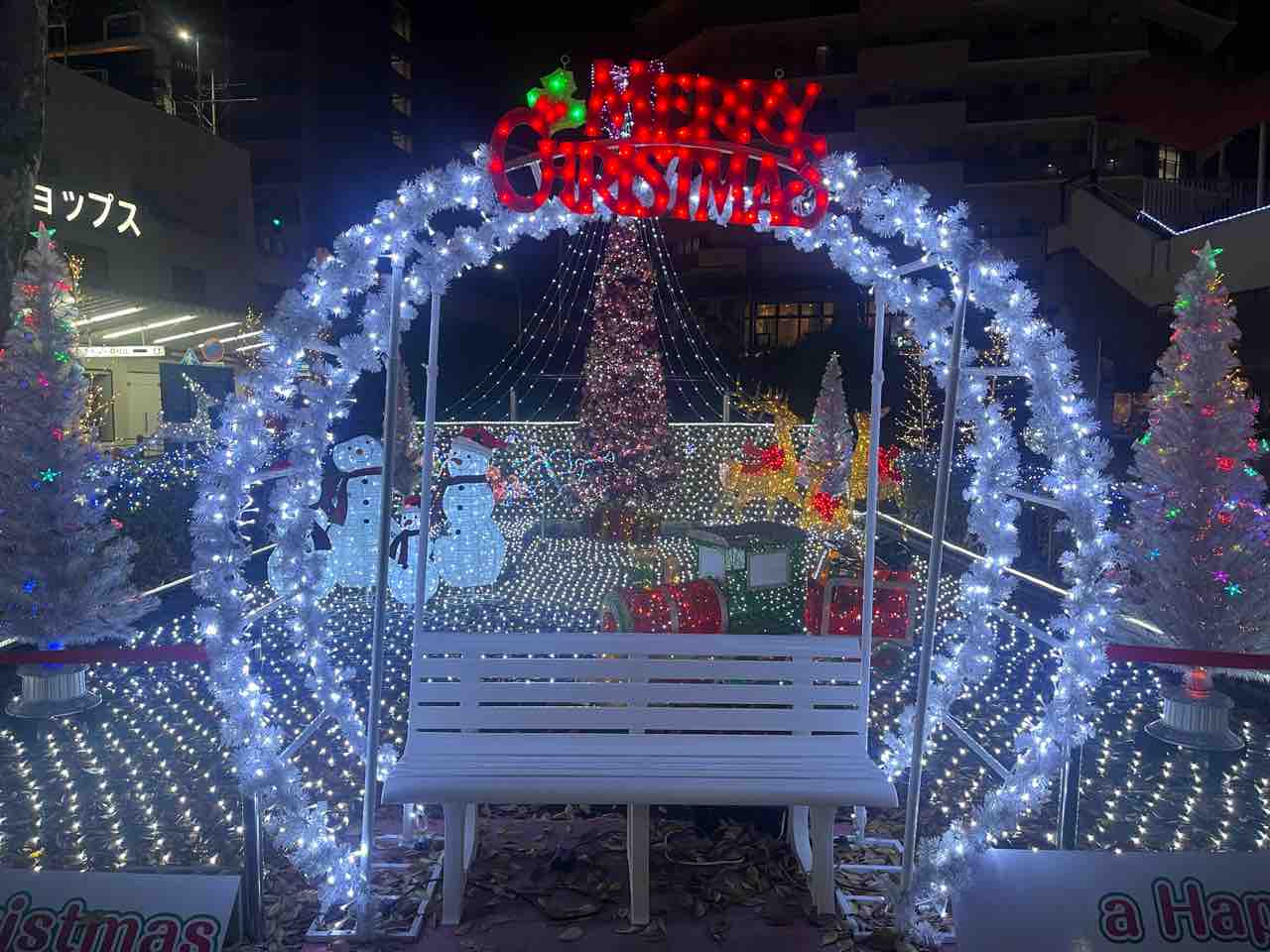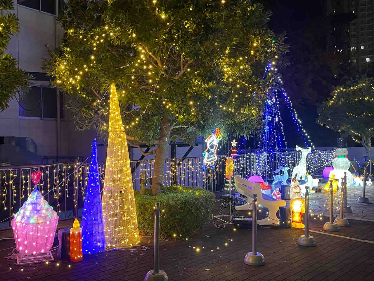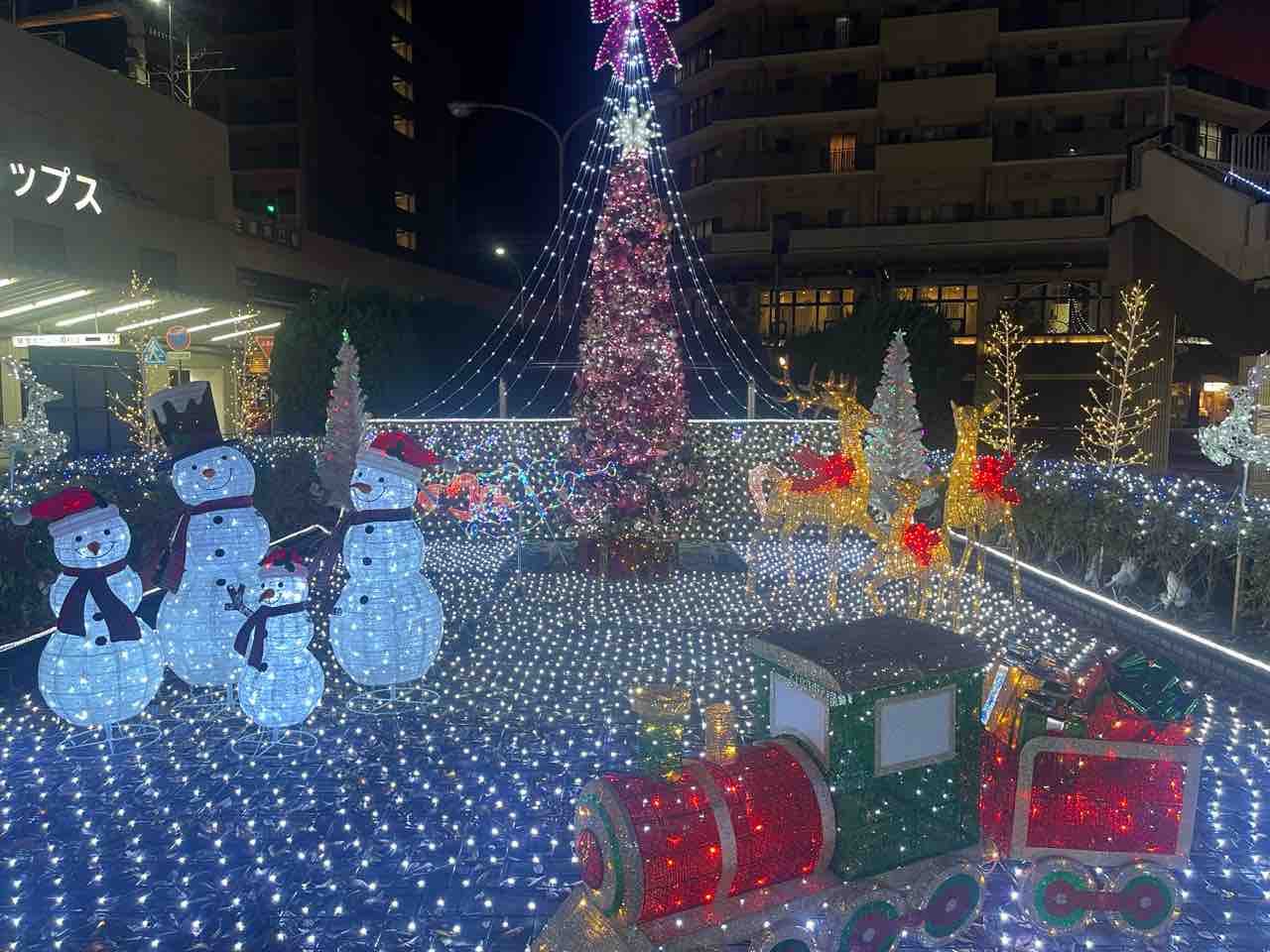 ベンチの奥はこんな感じ。綺麗ですね。ツリー、スノーマン、トナカイ、クリスマスの定番が揃っていて気分が上がります。