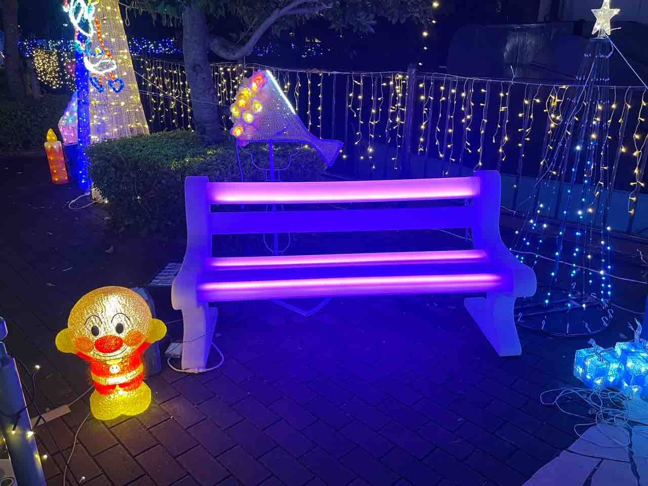 光るベンチとアンパンマンです。これはお子様連れにはポイントが高いですね。ベンチは光っぱなしではなく、パターンでついたり消えたりします。