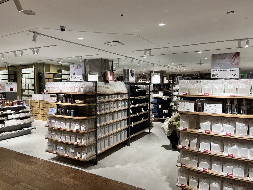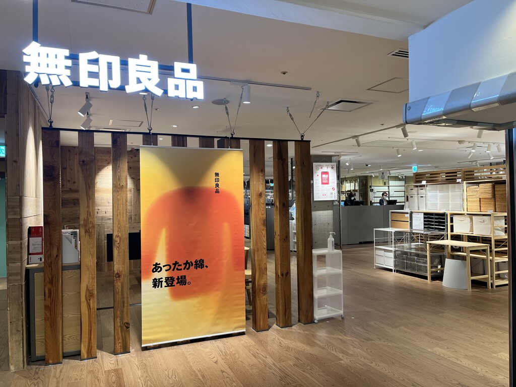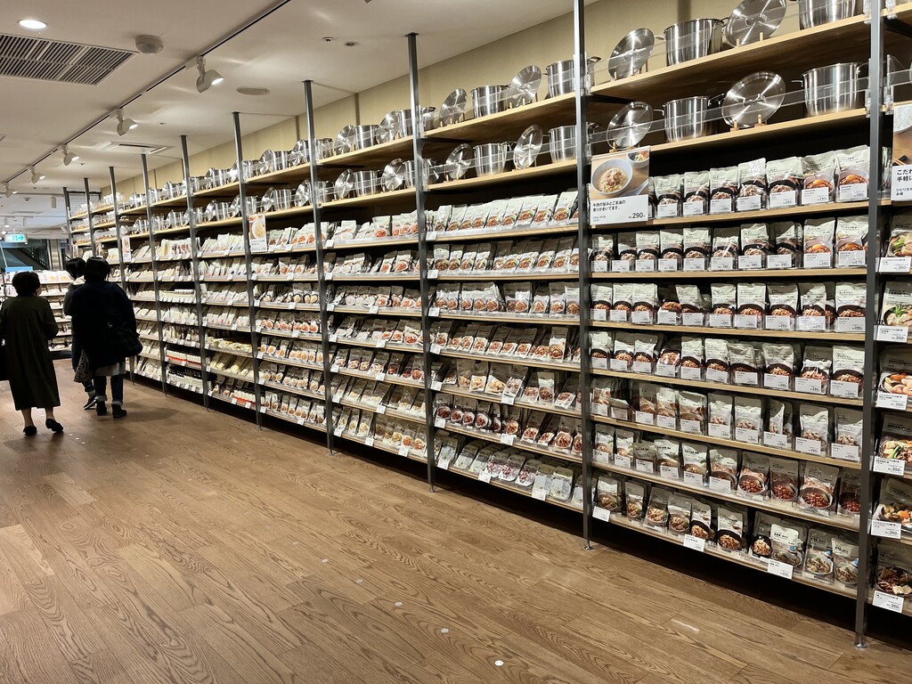 まずは、MUJI(無印良品)。以前はファッションと暮らしのゾーンがあったエリアです。駅側の食料品売り場から行くと、まず一面にずらっとたくさんのレトルト食品が並んでいます。