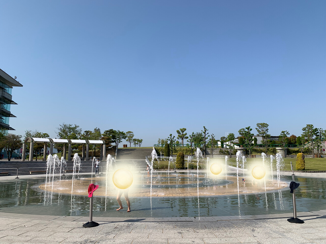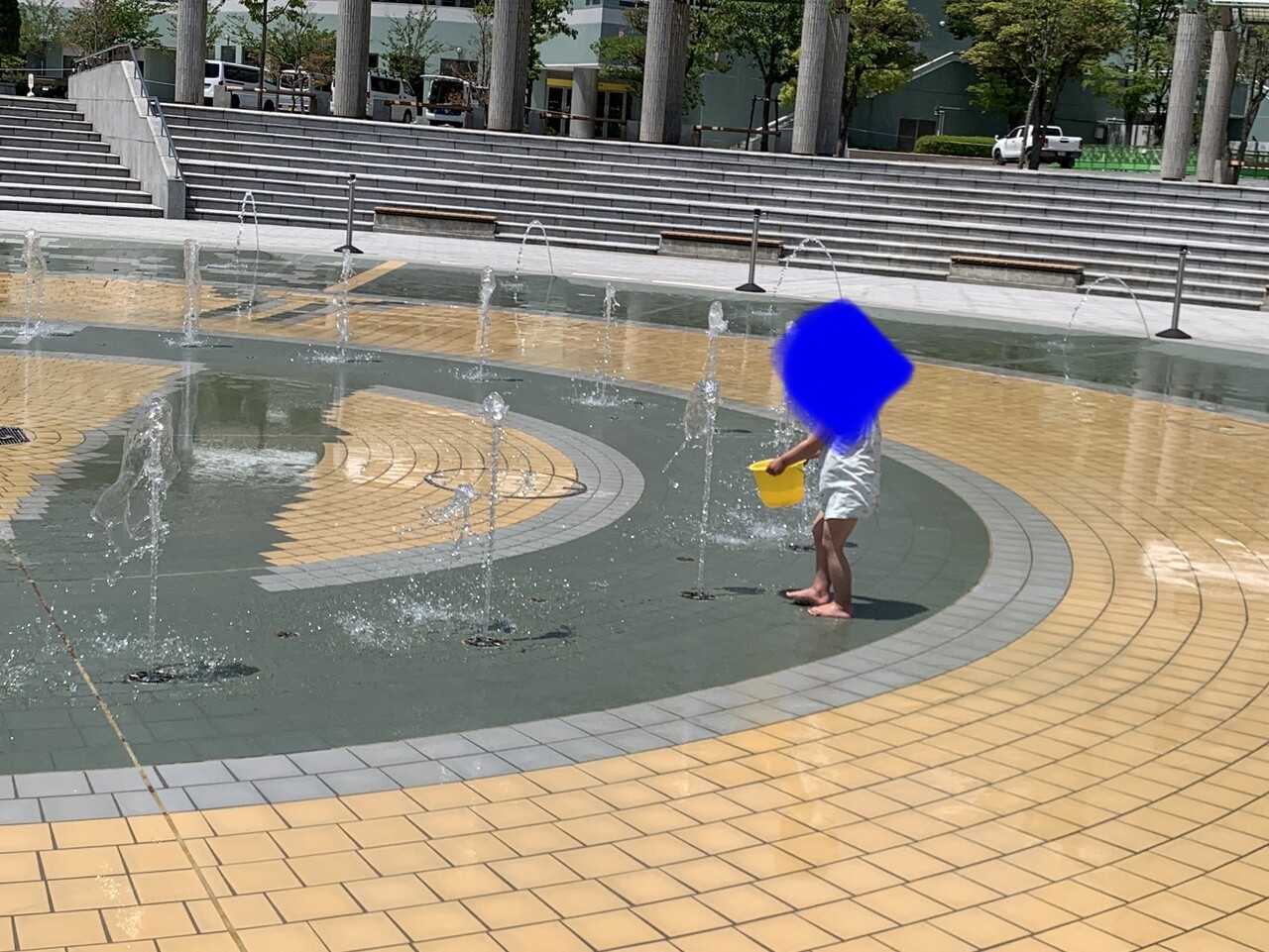 水遊びと言っても、プールではなく数分間隔で地面から水が飛び出す広々とした噴水広場。小さなお子さまも水に触れて遊べます。