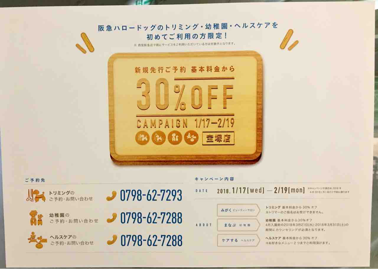阪急ハロードッグのトリミング、幼稚園、ヘルスケアを初めてご利用の方限定の先行予約キャンペーン。2月19日まで。