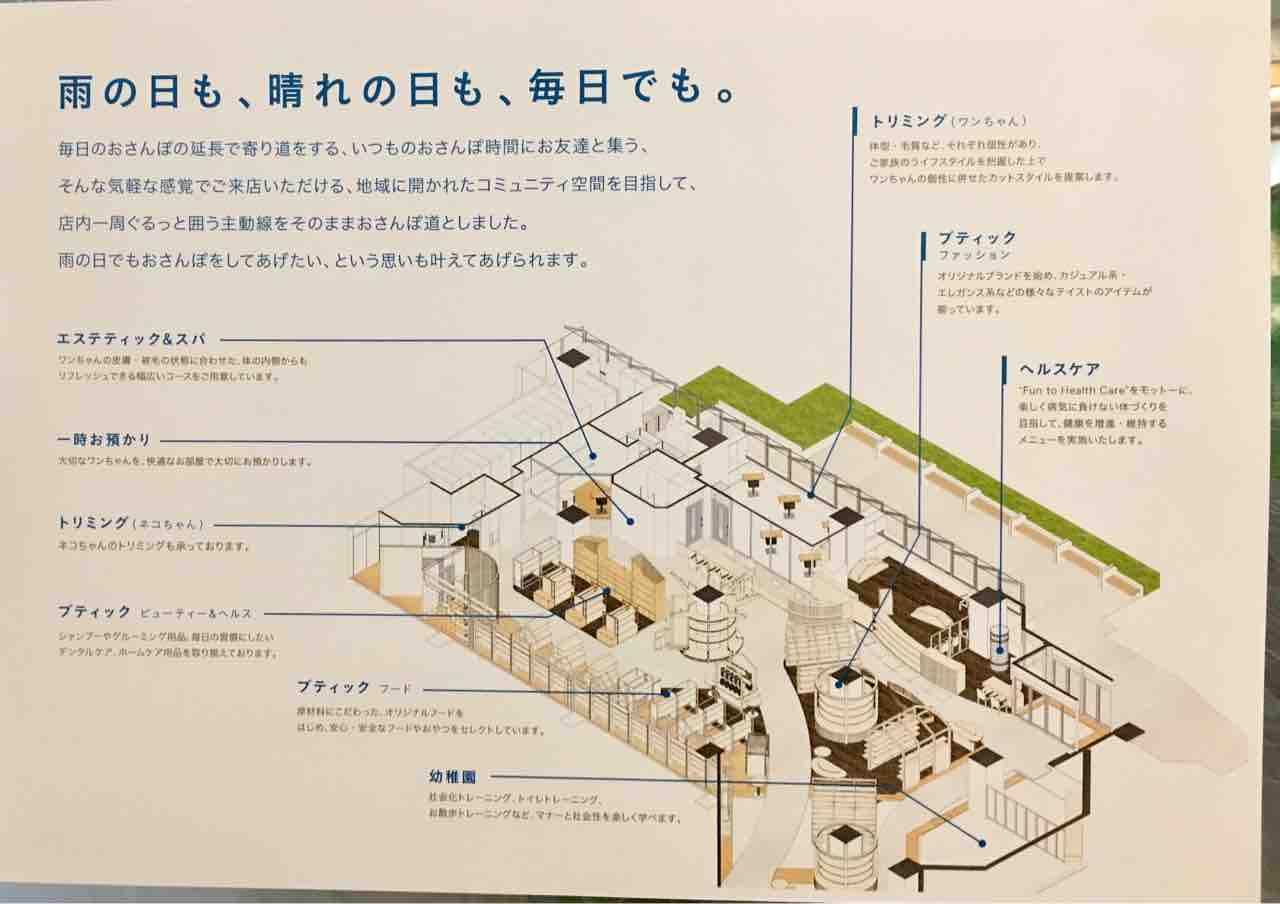 エステティック&スパ、一時お預かり、トリミング、ブティック、幼稚園、ヘルスケアなどの施設があり、お散歩がてら立ち寄れる空間になるようです。